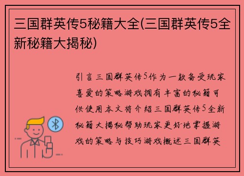 三国群英传5秘籍大全(三国群英传5全新秘籍大揭秘)